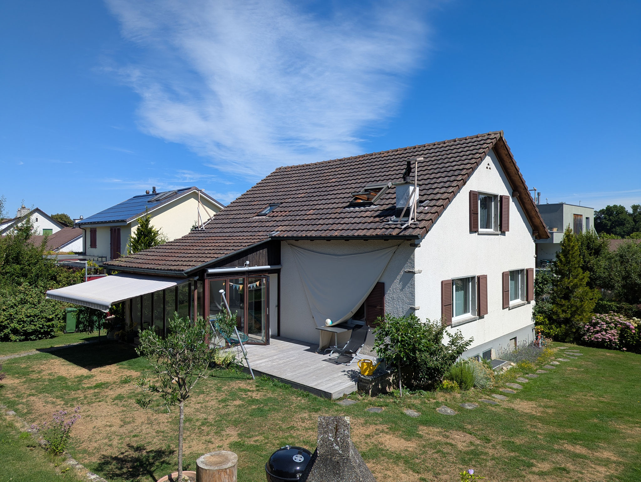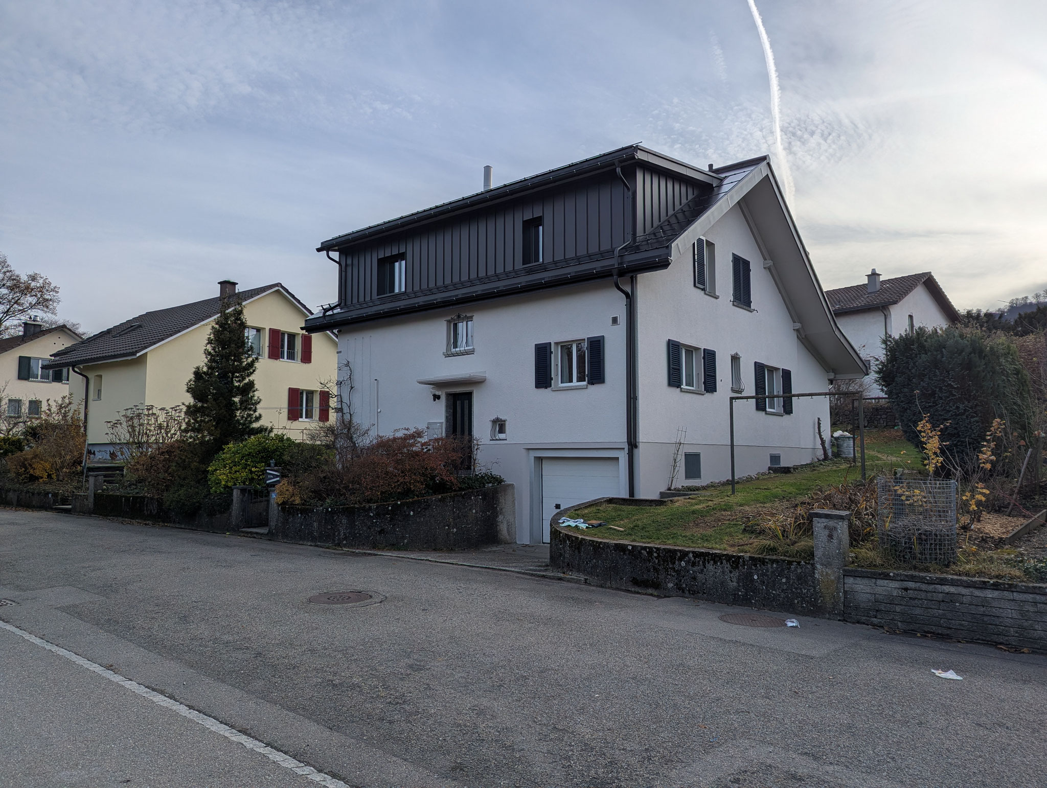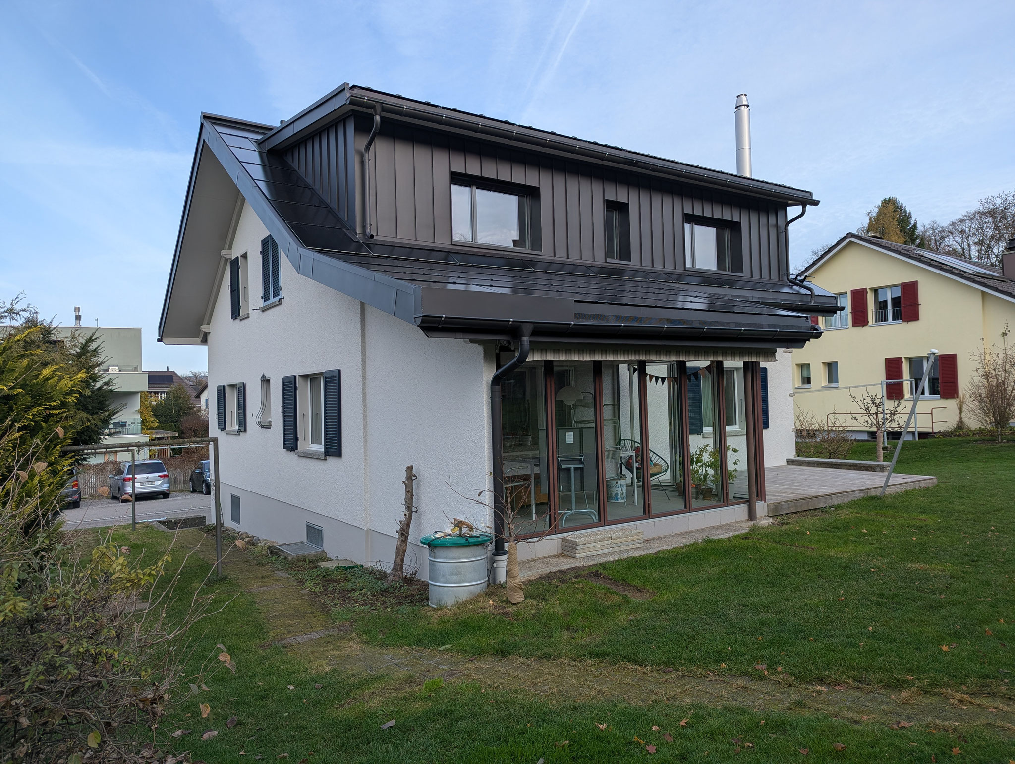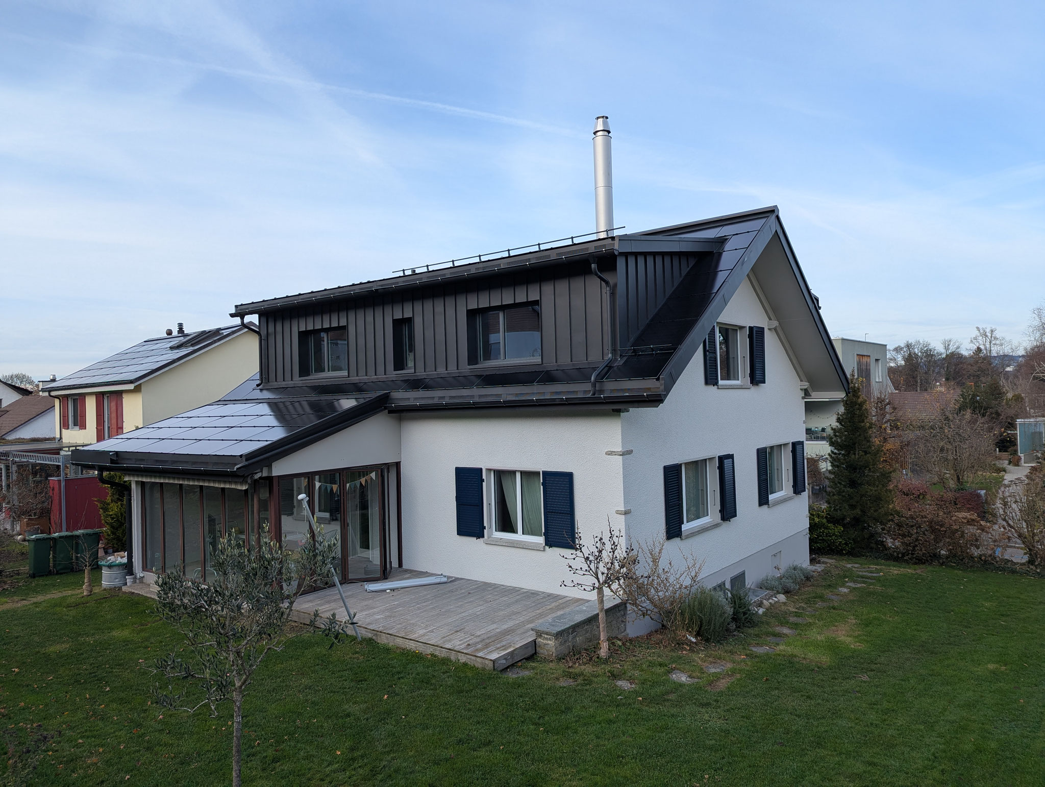 Dieses Einfamilienhaus in Wabern, mit den typischen abgeschrägten Räumen im Dachgeschoss, erhielt ein Upgrade. Um unter dem Dach ein vollwertiges Geschoss zu nutzen, realisierten wir diese Aufstockung mittels einer Lukarne, die die ganze Fassadenbreite aufnimmt. In diesem Zusammenhang wurde das Dach erneuert und mit einer Indach PV-Anlage versehen. Die Farbe und Materialisierung wurde aufeinander abgestimmt und so entstand dieses moderne Familienhaus, welches den ursprünglichen Charakter beibehalten hat.